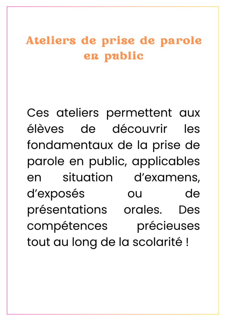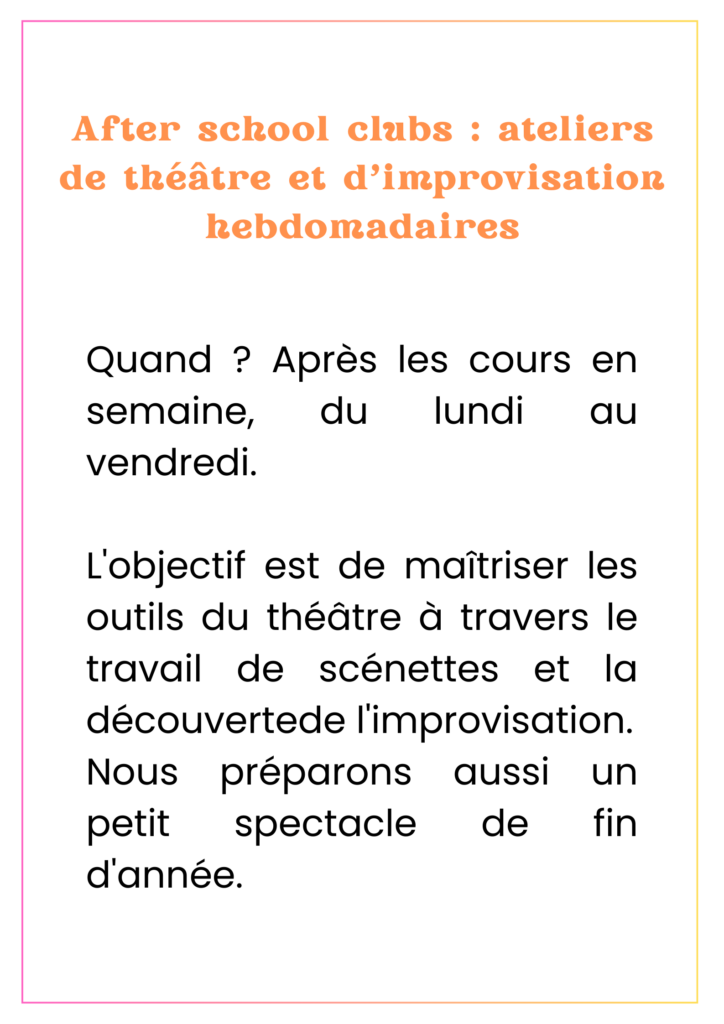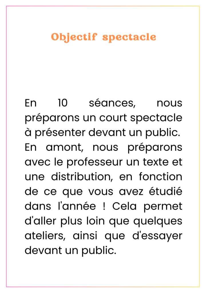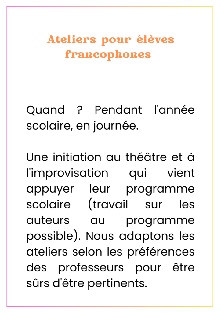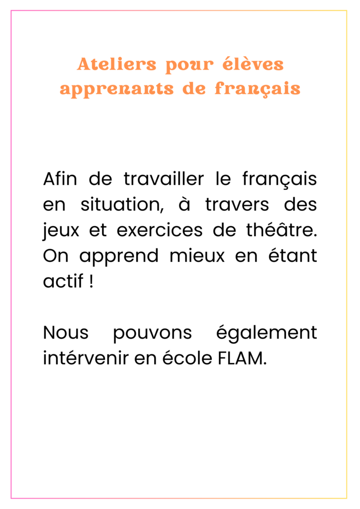 Nous proposons des ateliers de théâtre en français pour francophones et pour apprenants de la langue française. Le théâtre est un outil qui permet de prendre confiance en soi tout en s’amusant. C’est ainsi un soutien précieux pour développer ses capacités de communication.